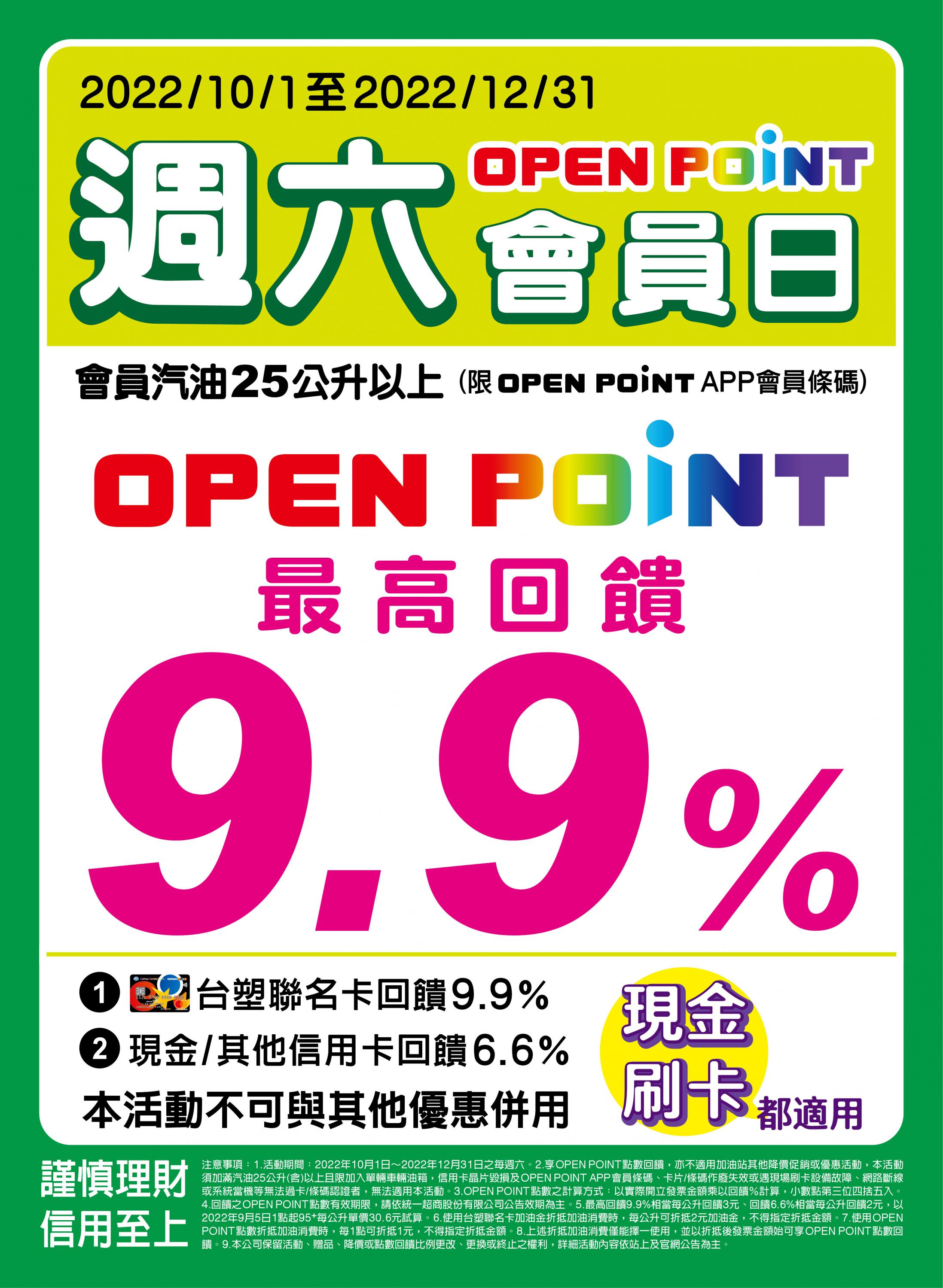 OPEN POINT會員於活動期間每週六至台塑加油站出示OPEN POINT APP會員條碼,汽油加滿25公升(含)以上享有OPEN POINT點數累點(人工、自助加油皆適用) ; 本活動不得與其他優惠併用。