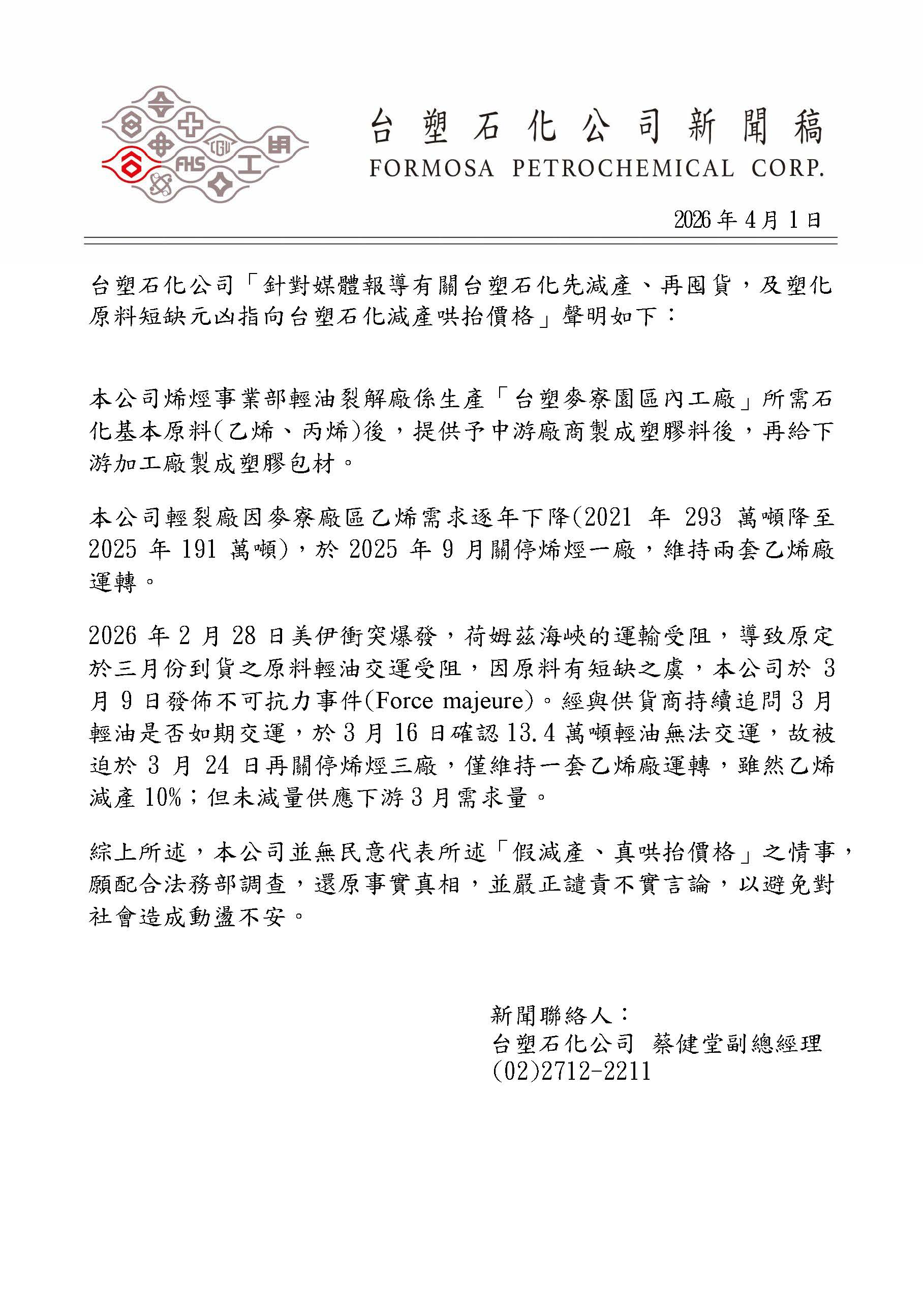 針對媒體報導「有關台塑石化先減產、再囤貨,及塑化原料短缺元凶指向台塑石化減產哄抬價格」聲明如下: